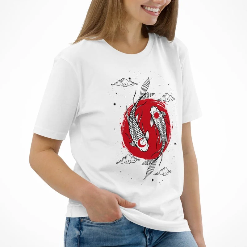 Una camiseta japonesa con un elegante diseño de dos carpas koi, símbolo de perseverancia y suerte en la cultura japonesa. Fabricada en algodón 100% orgánico, esta camiseta unisex tiene un tacto suave y cómodo. Gracias a su estampado de alta calidad, los colores se mantienen vivos incluso después de varios lavados, mientras que el corte recto y las mangas ajustadas garantizan un estilo moderno y muy ponible.
