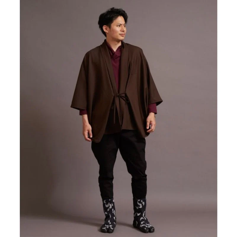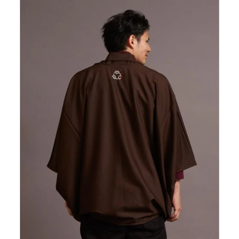 Cómoda y fácil de llevar, esta chaqueta kimono marrón para hombre es una mezcla única de tradición y modernidad. Las mangas y el cuello recuerdan a la tradicional chaqueta haori. El tejido fluido y el corte holgado añaden un toque de elegante y moderno. Su espalda presenta un diseño bordado. Tiene un pequeño bolsillo de tela en el pecho. Esta chaqueta se convertirá en una pieza clave de tu armario, de esas que te pones a menudo y conservas durante mucho tiempo.