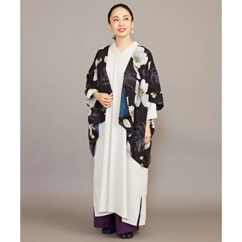 Esta chaqueta kimono de vestir para mujer es la combinación perfecta de elegancia tradicional y moderna. Su corte holgado es corto por delante y largo por detrás. Las mangas son hasta el codo, como las de un kimono. Tiene escote abierto y escote de pico en la espalda. Es reversible, la chaqueta kimono para mujer es la prenda perfecta para llevar en la maleta. Durante el día, puedes ponértela para vestir elegante con su bonito color liso de rayón. Por la noche, el maxi motivo floral aportará carácter a tu look japonés.