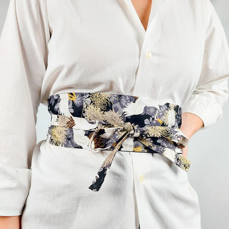 Si quieres añadir un toque japonés original a tus outfits diarios, te encantará este maravilloso cinturón obi con estampado de grullas. En Japón, esta majestuosa ave simboliza la longevidad y la buena fortuna. El diseño de su tela combina grullas y flores de crisantemo, emblema de la familia imperial.