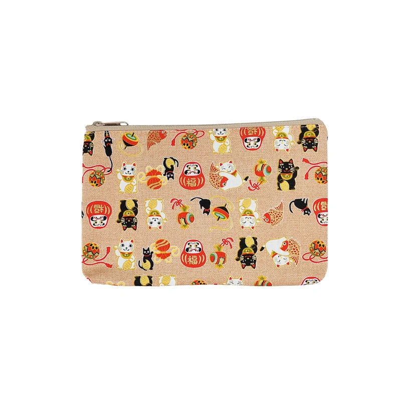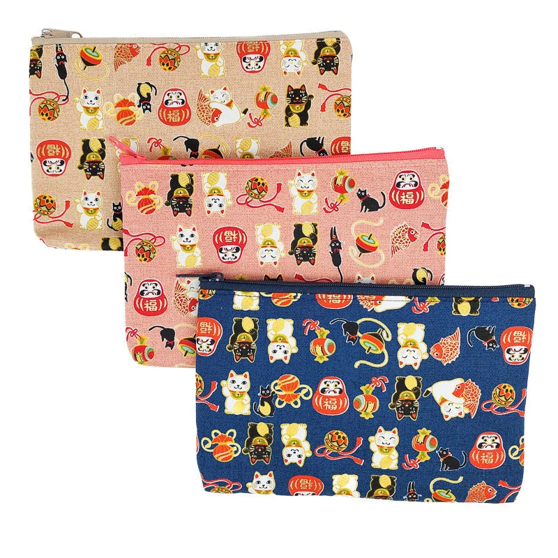 Este estuche de tela japonés tiene Maneki Neko, Daruma, carpas koi y otros símbolos considerados verdaderos amuletos de la buena suerte en Japón.