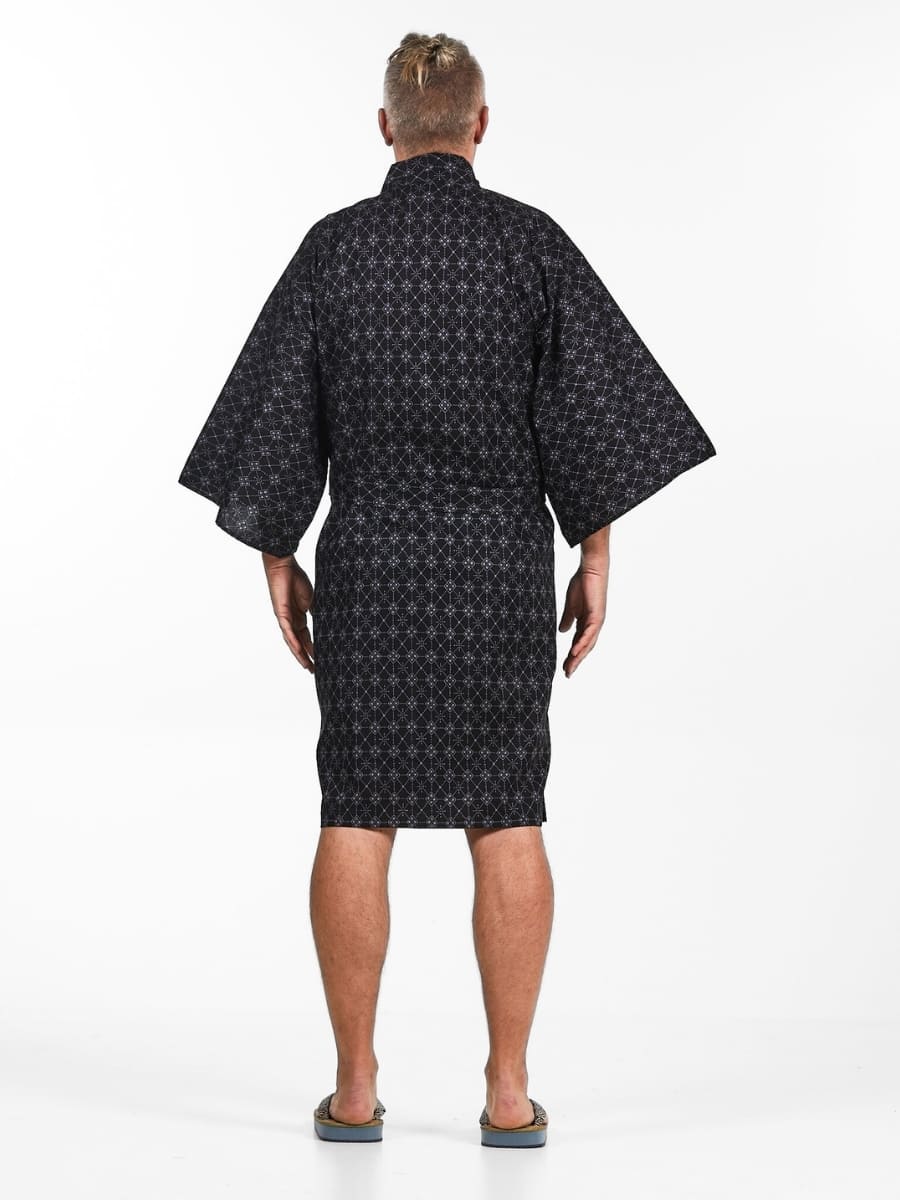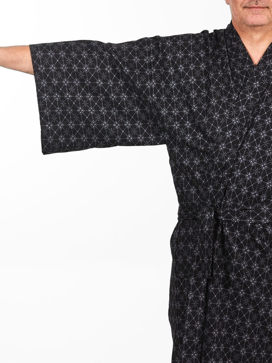 El kimono Happi Homme Hishigata combina sencillez y elegancia con su discreto estampado de rombos sobre fondo negro, un clásico atemporal de la moda japonesa. Confeccionado en Kioto con algodón 100%, ofrece una comodidad óptima para tus momentos de relax. El cinturón a juego garantiza un ajuste perfecto, y el bolsillo delantero le da un toque funcional. Este kimono es ideal para los amantes del estilo minimalista, y además añade un sutil toque japonés a tu vida cotidiana.