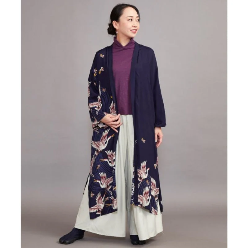 Chaqueta kimono larga de mujer con estampado de grullas