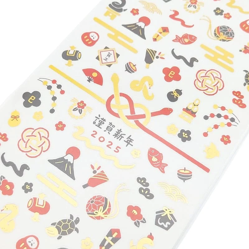 Celebra el Año de la Serpiente con esta bonita hoja de pegatinas fabricadas en Japón con papel japonés de alta calidad. Estas pegatinas, inspiradas en las tradiciones japonesas, presentan motivos de la suerte como la serpiente, el daruma, el monte Fuji y los nudos mizuhiki, símbolos de prosperidad y renovación. Los colores dorado, rojo y negro añaden un toque elegante a tus tarjetas de felicitación y decoraciones festivas. Son muy fáciles de usar, te ayudarán a embellecer tus creaciones y a dar la bienvenida al Año Nuevo con un toque de tradición y buena suerte.