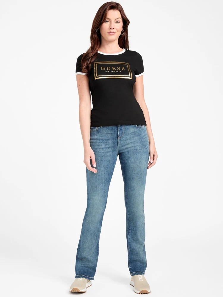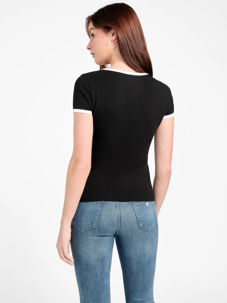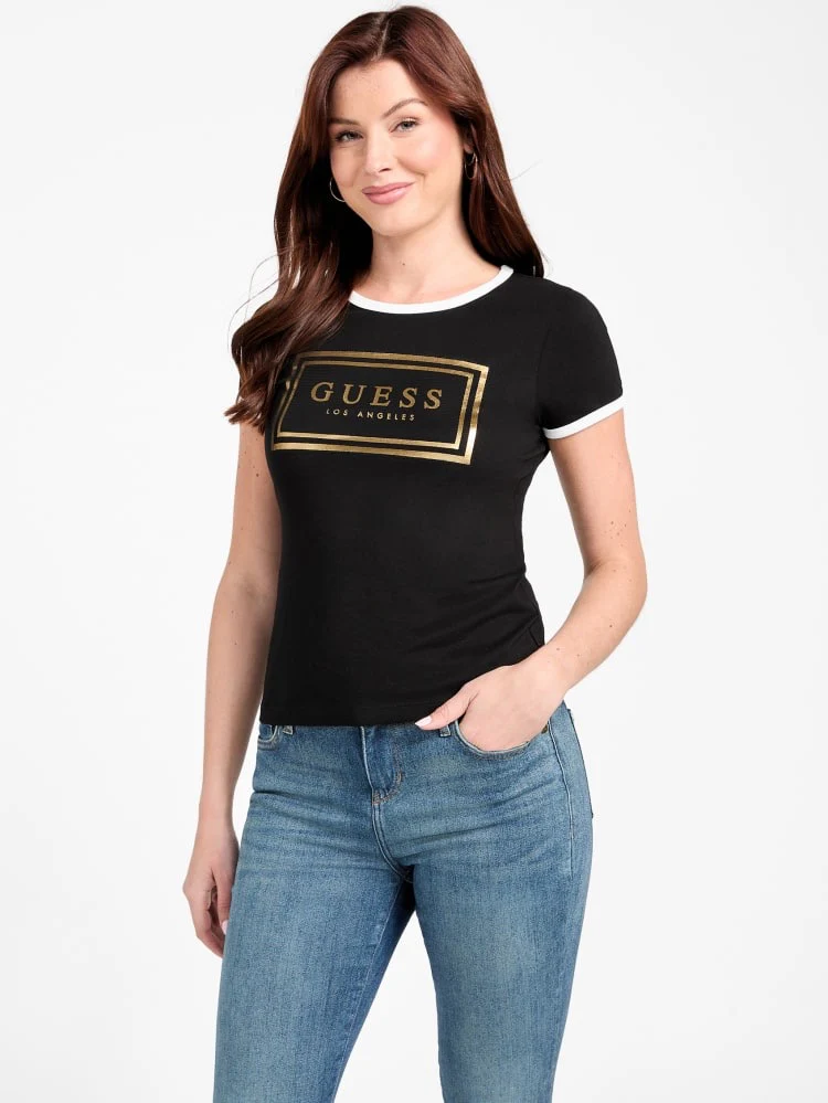 Playera de la marca Guess en color negro con estampado en color dorado y el cuello blanco
