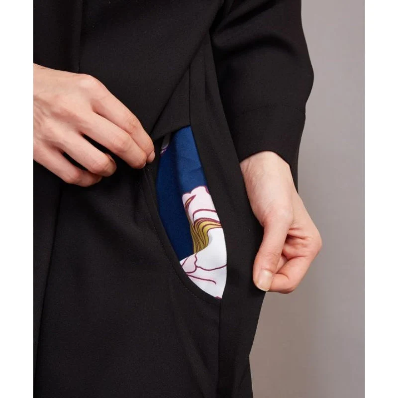 Este moderno vestido japonés sigue el diseño del kimono tradicional para crear una prenda de moda única y elegante. La parte delantera del vestido es sencilla y minimalista, es ancho, tiene cuello kimono y mangas largas. Por detrás, la espalda se abre para revelar un magnífico estampado floral japonés (flor de melocotonero). El estampado también aparece en los bolsillos laterales.