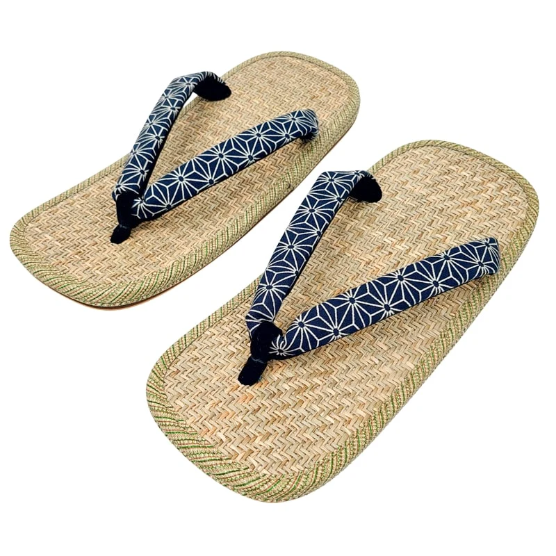 Estos zoris japoneses son elegantes y cómodos, perfectos para completar tu look japonés. Su suela está fabricada con un tejido panamá de hierba malaya, que las hace naturalmente transpirables y muy resistentes al calor. Sus correas (hanao) están decoradas con el motivo Asanoha, un símbolo tradicional japonés que representa hojas de cáñamo, para un estilo refinado y atemporal. La plantilla de caucho sintético proporciona una excelente amortiguación para una mayor comodidad durante todo el día. Totalmente hechas a mano por artesanos, estas sandalias zori encarnan la artesanía japonesa en cada detalle.