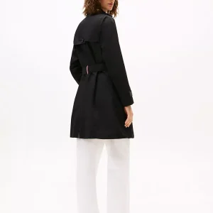 Gabardina Tommy H azul marino, botones café, cinturón y broche en cuello